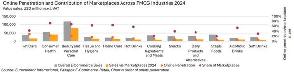 🔹Euromonitor verilerine göre, online penetrasyon(bir kategorinin toplam satışları içinde online kanalın payı) kategoriler arasında farklılık gösterse de; online satış payı yüksek olan kategorilerde pazaryerlerinin katkısı da belirgin şekilde artıyor. Özellikle Consumer Health(Tüketici Odaklı Sağlık Hizmetleri) ve Beauty(Güzellik) kategorileri hem yüksek online penetrasyona hem de güçlü pazaryerine payına sahiptir.
