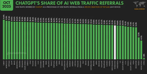 ChatGPT ist derzeit die meistbesuchte KI-Plattform weltweit. Laut Bericht steht die Türkei mit einem Anteil von 94,4 % am KI-Web-Traffic, der auf ChatGPT entfällt, weltweit an erster Stelle. Es folgen Marokko mit 91,9 % und Kolumbien mit 90,1 %. Diese Zahlen zeigen, dass ChatGPT insbesondere in der Türkei im Vergleich zu anderen KI-Tools eine deutlich stärkere Position einnimmt.