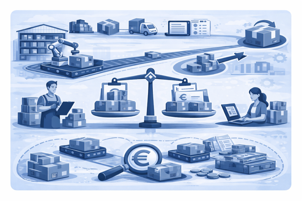 Die Auftragsbearbeitung ist der Bereich, in dem Kosten schnell eskalieren können. Kommissionierungskosten hängen von der Pick-Logik ab: Ein Produkt pro Bestellung ist günstiger als viele Positionen, Bundle-Artikel oder personalisierte Varianten. Dazu kommen Prozesskosten wie Scanning, Qualitätschecks, Etikettierung und Exception Handling.