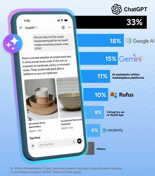 58% of consumers state that they use AI tools for product research. Among them, ChatGPT is the most preferred tool with a 33% usage rate.