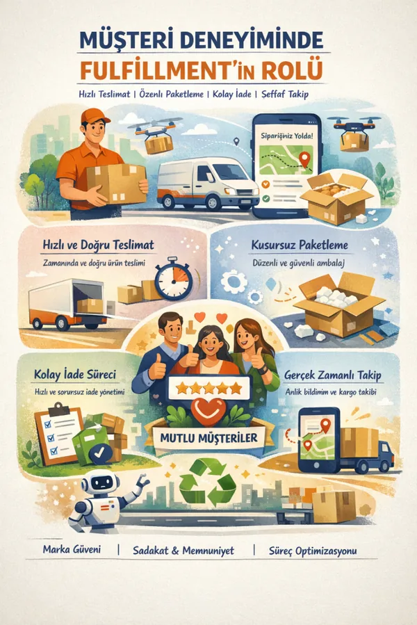 E-ticarette müşteri deneyimi (CX) çoğu zaman “ürün kalitesi”yle başlıyor gibi görünür; ama müşterinin zihninde asıl iz bırakan şey çoğunlukla teslimat hızı, paketleme kalitesi, şeffaf takip ve iade kolaylığıdır. Bu alanların tamamı doğrudan fulfillment süreci ile ilgilidir. Yani fulfillment sadece operasyon değil; marka güveni ve müşteri memnuniyeti üreten bir sistemdir.